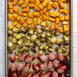 Maple Sheet Pan Smoked Sausage with Butternut and Brussels.