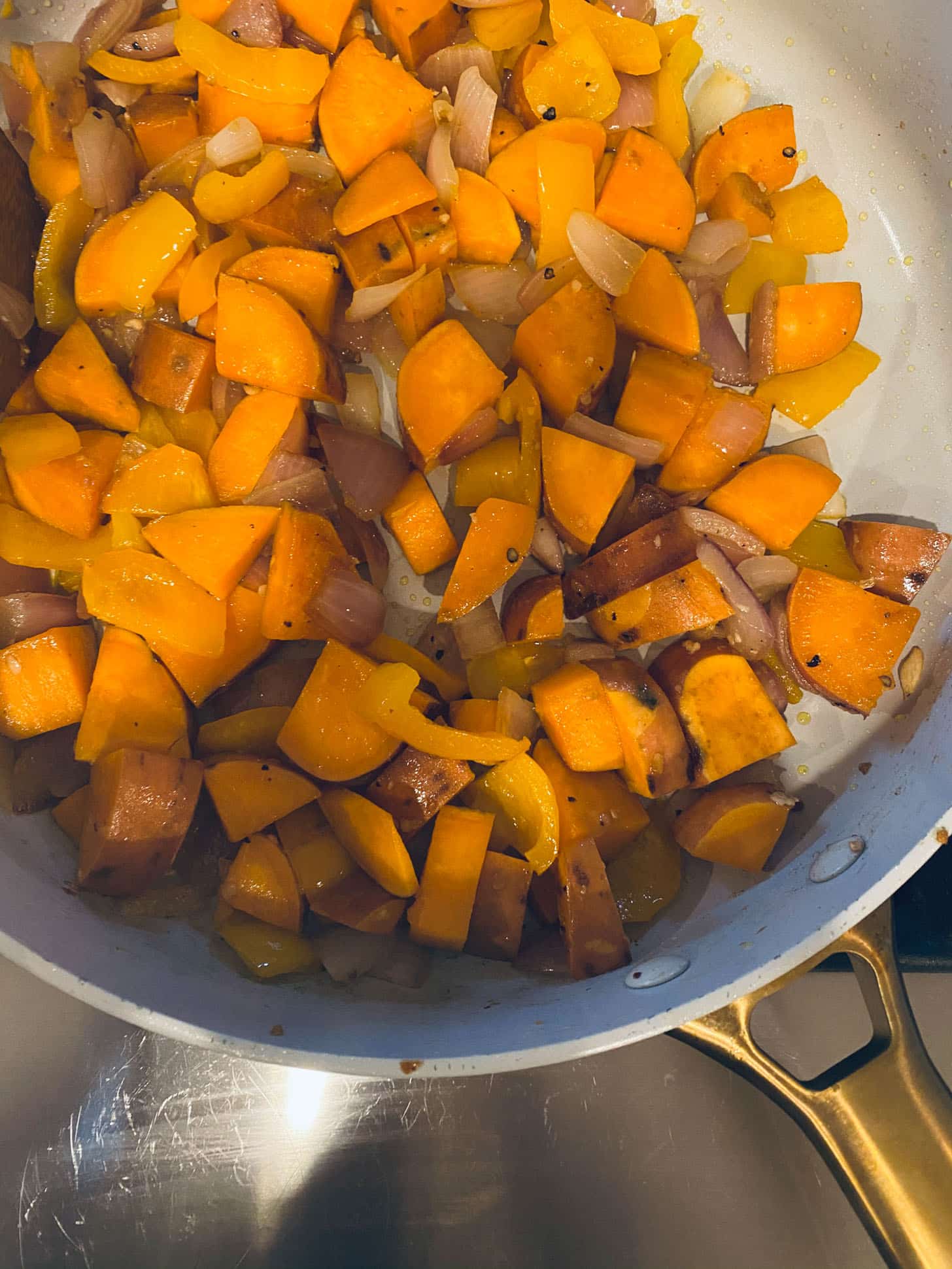 This is one of our favorite quick dinners. Makeshift sweet potato hash with peppers and onions.