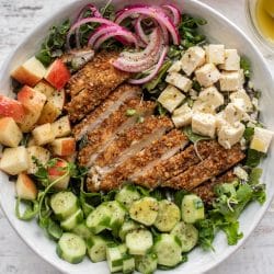 - While the chicken is baking, assemble the salad. Place the greens in a large bowl with a pinch of salt and pepper. Add in the chopped apples, cheddar, cucumbers and pickled onions.