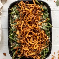 This green bean casserole from scratch is super delicious and topped with french fried onions! It's comforting and wildly flavorful.