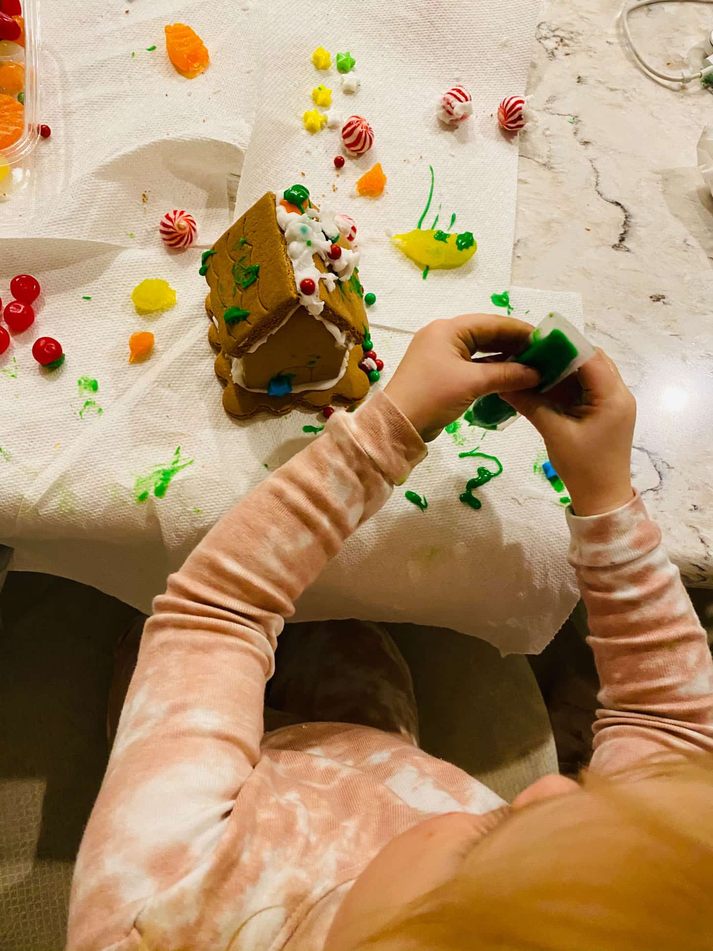 Saturday night we made mini gingerbread houses. The kids did them all by themselves.