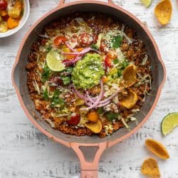 BUT! My favorite thing to do with this skillet? Serve it as is with some tortilla chips on the side. Almost like a taco dip of sorts. It’s not REALLY a dip – it’s just my favorite turkey taco mix, cheese, quick pico, lettuce and guac.
