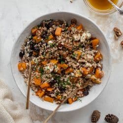 This warm winter farro salad is hearty and nourishing. Butternut squash, goat cheese, cranberries and pecans make this irresistible.