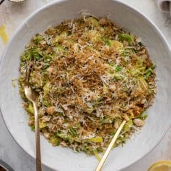 This warm brussels crunch salad is loaded with texture and flavor! Toasty breadcrumbs, marcona almonds and parmesan make this delish!
