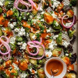 Crispy, golden brussels sprouts roasted with buffalo wing sauce, melty blue cheese, pickled onions and maybe a drizzle of ranch.