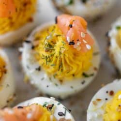 - Slice a small strip of the smoked salmon and twist it or roll it, placing it on top of the deviled egg mixture. Sprinkle with a pinch of everything seasoning. Repeat with remaining eggs and serve!