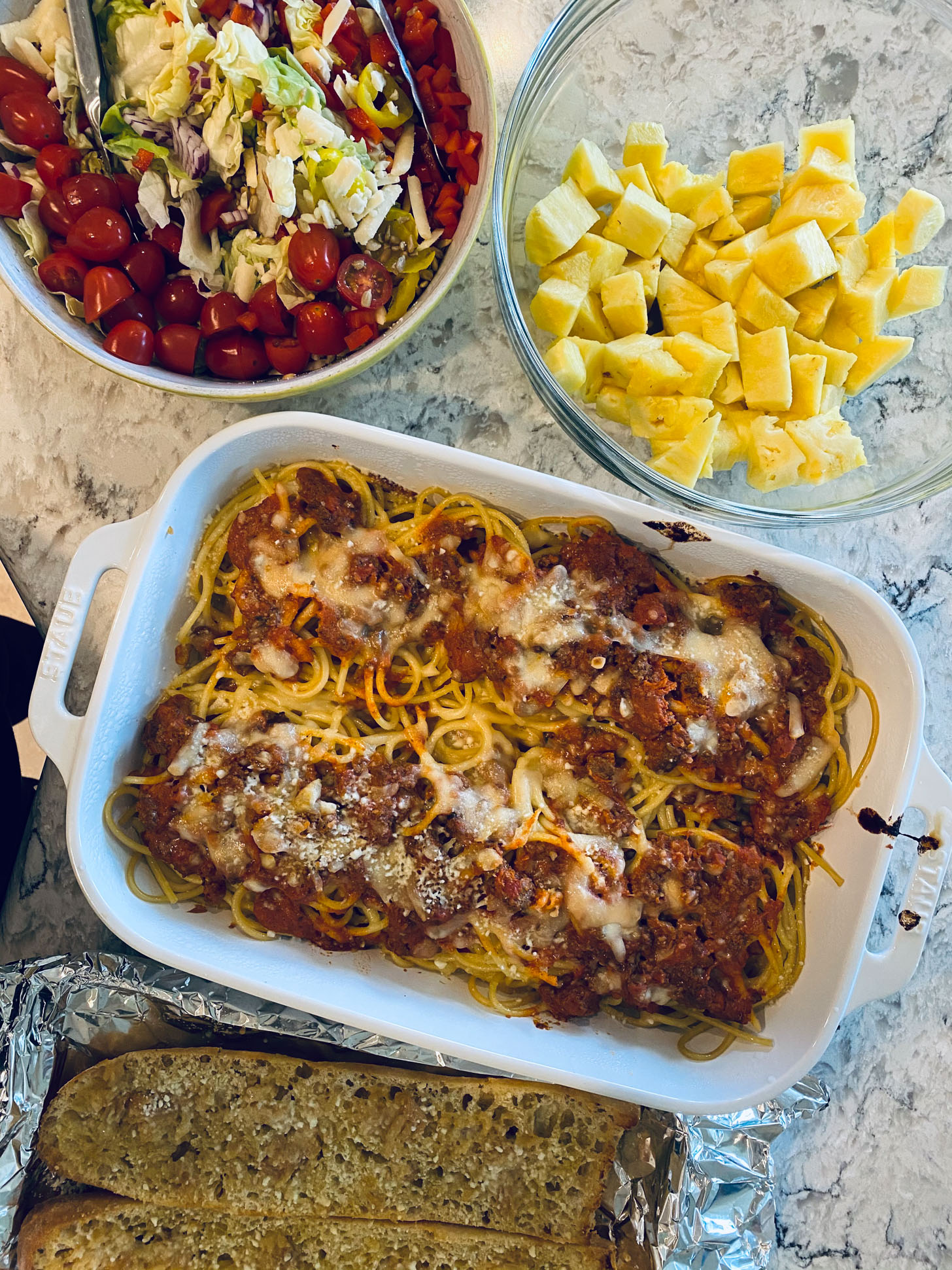 A big old pan of baked spaghetti, the amazing garlic bread from Everyday Dinners, a house salad and some pineapple. The pineapple is SO GOOD right now.