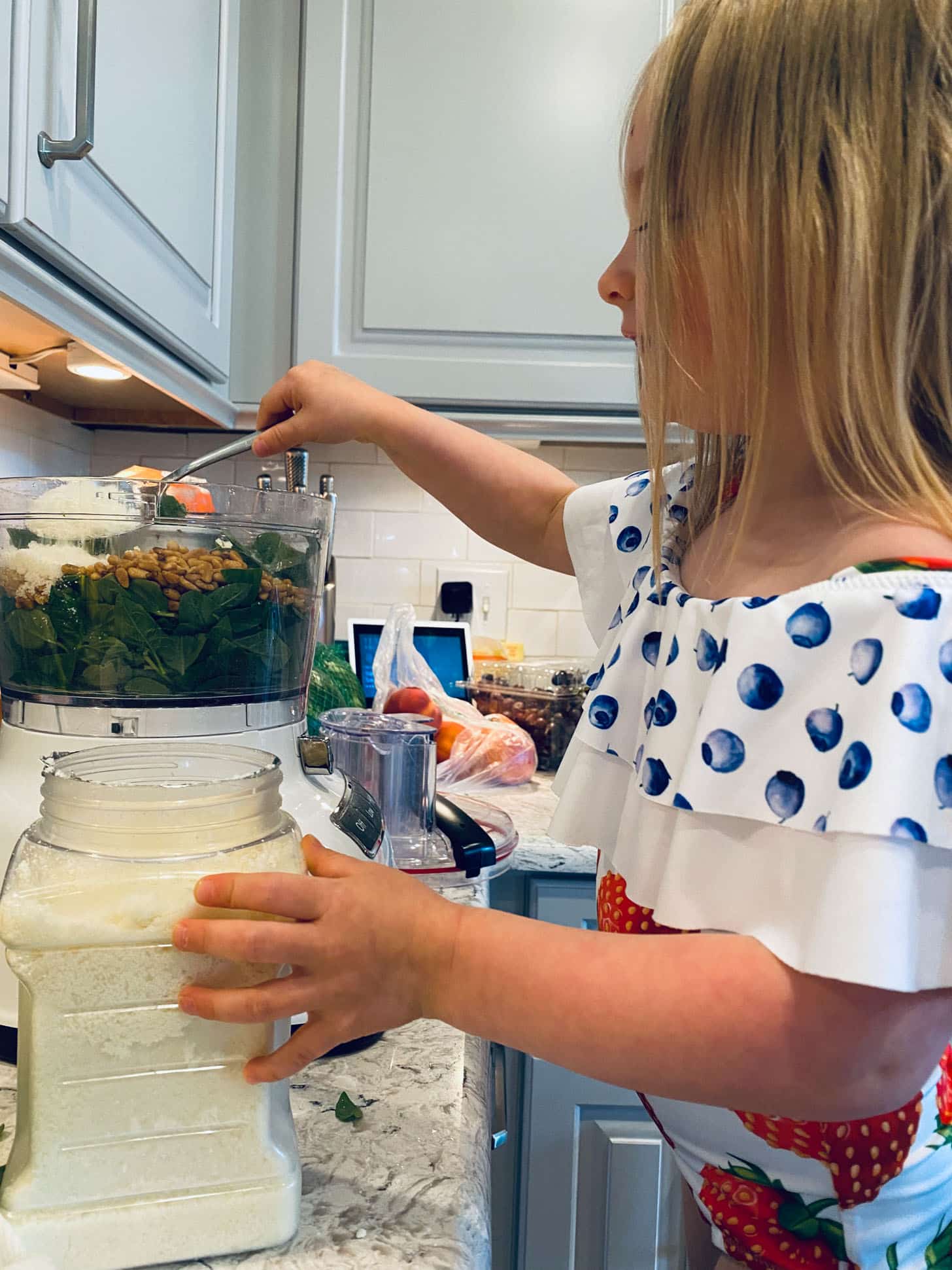 Emilia was super excited to help and then she proceeded to eat multiple spoonfuls of plain pesto.