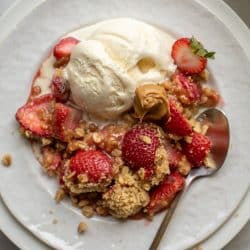 This peanut butter strawberry crisp is essentially the perfect peanut butter jelly dessert that tastes delicious and may send you into a spin of nostalgia at the same time!