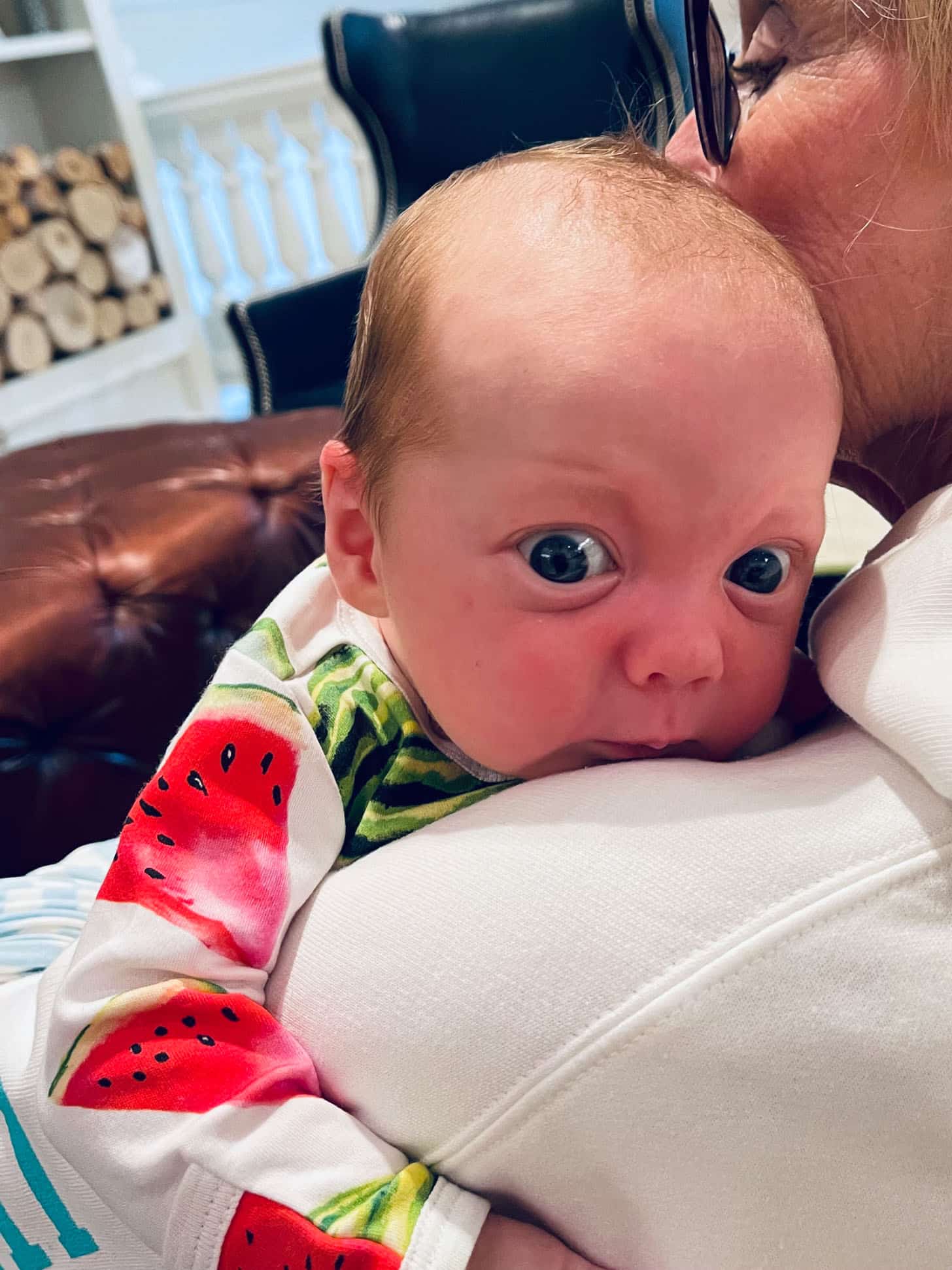 This is what happens when you go to a pool party and have a huge diaper explosion and your mom only has long sleeve sleepers in the 97 degree heat. Naked baby!