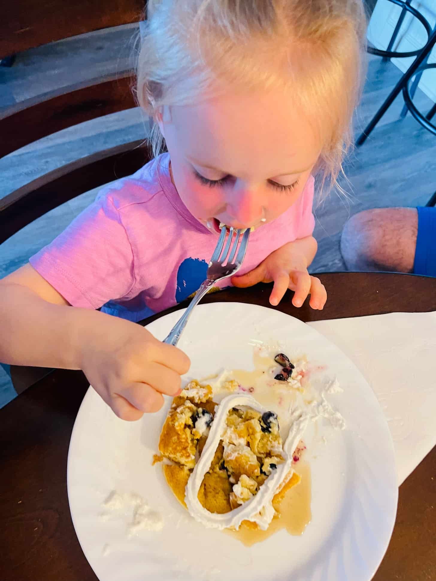Emilia requested my dad’s blueberry pancakes with “shaving cream” every day.