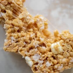 These salted peanut butter rice krispy treats are one of our favorite treats! Extra chewy and filled with marshmallows and flaky salt.