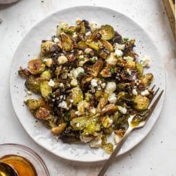 Hot honey brussels sprouts are the perfect side dish! Crispy brussels sprouts that are sweet & spicy, topped with feta and chives. So delicious enough to eat right off the pan.