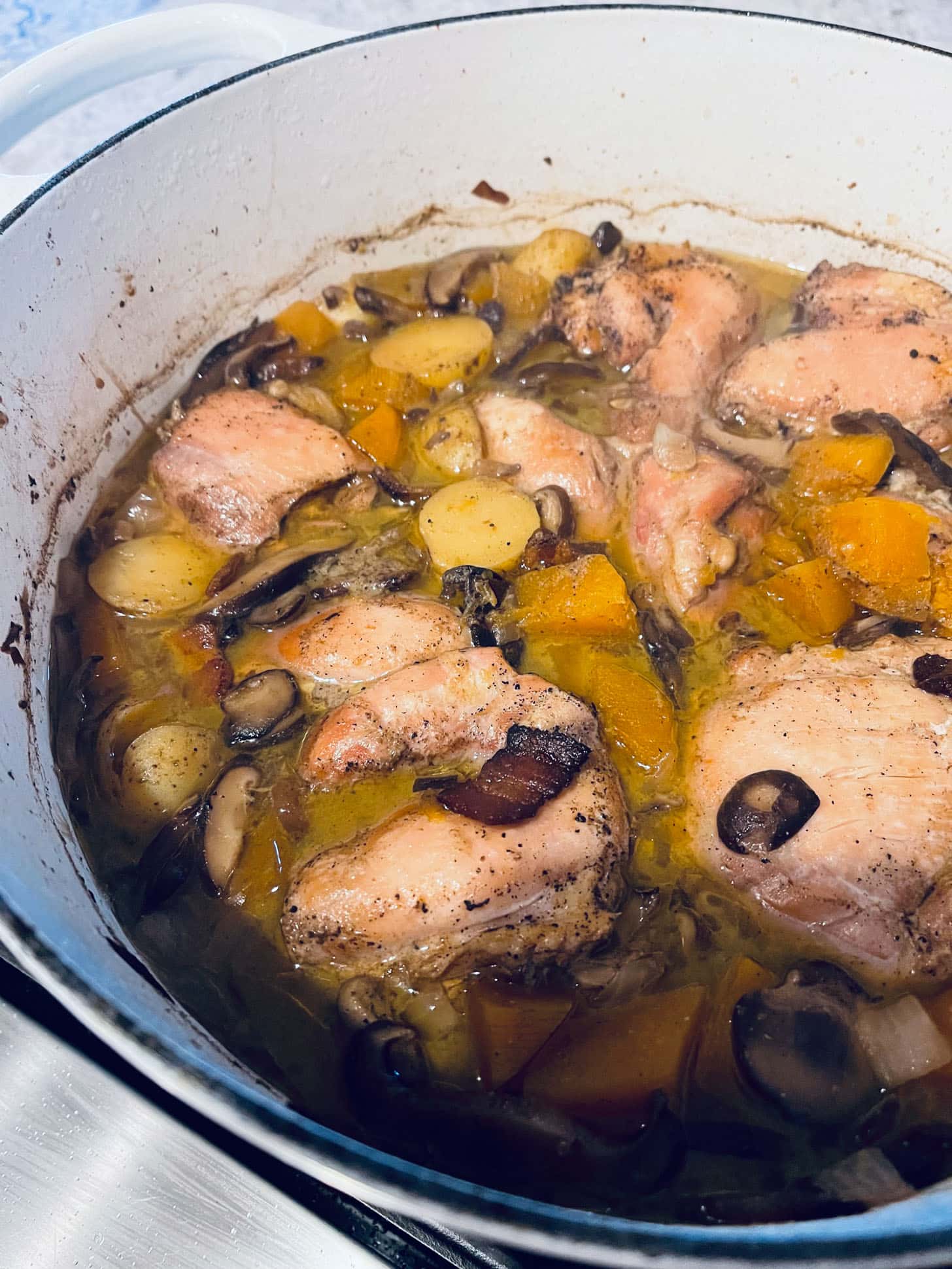Threw together this chicken stew situation with some butternut squash, mushrooms, onions, leftover potatoes and bacon.