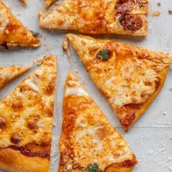 We love this vodka sauce pizza! Flavorful crust topped with perfect vodka sauce and fresh mozzarella. Sprinkle with basil and parmesan. It’s absolutely incredible.
