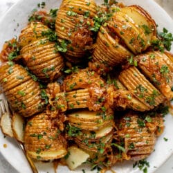These hasselback potatoes are crispy bites of perfection! Drizzled with garlic brown butter and topped with fresh herbs and caramelized onions, they are so, so delicious.
