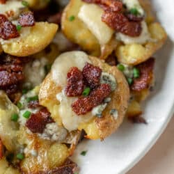 These crispy bacon smashed potatoes are topped with melty blue cheese and chipotle bacon. Green onions finish things off for the most amazing texture and flavor!