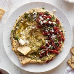 You can 100% make this snack your own. Choose (or make!) a kale pesto over the traditional basil one. Maybe you want to swap roasted red peppers for the sun-dried tomatoes. You really can’t go wrong as long as you’re using ingredients you enjoy. Hummus is such a delicious blank canvas and works with so many other flavors.