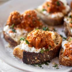 These meatballs in vodka sauce are outstanding. Tender, juicy meatballs cooked in vodka sauce and served on toasted sourdough that is spread with ricotta cheese. Dreamy! Cozy and comforting and delicious.