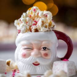 This peppermint popcorn is so fun and festive! Popcorn drizzled with white chocolate and topped with crunchy peppermint, then tossed with marshmallows. Perfect for snacking during the holiday season!