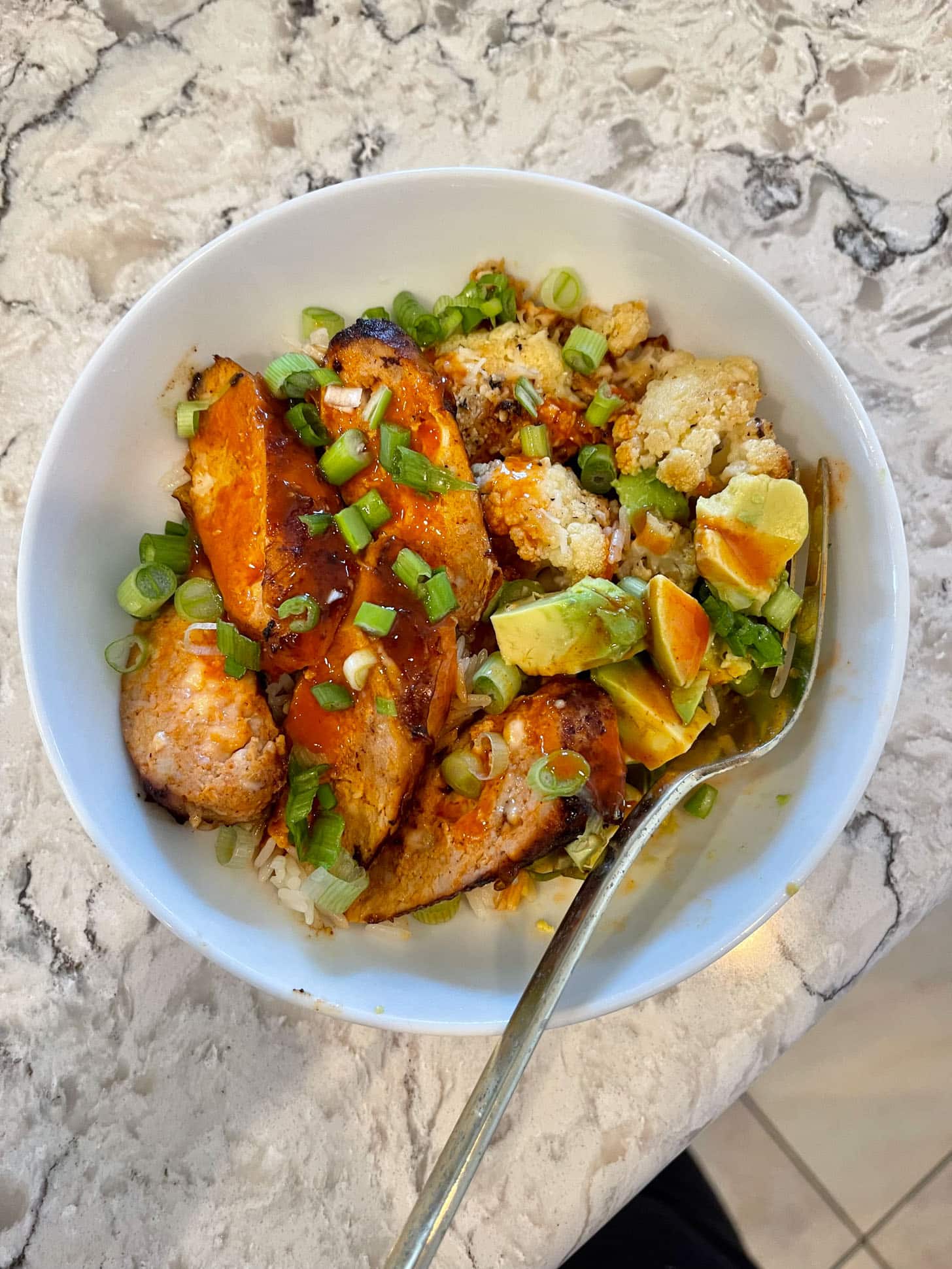This was our favorite of the week!! It’s buffalo chicken sausage and it’s AMAZING. It’s from Well Seasoned which is where Lacy’s husband works. They have these incredible custom boxes of seasoned meats at really good prices and we’re obsessed. This buffalo chicken sausage is wonderful, we love the sous vide steaks (they just need seared and are really high quality), the wings, pork tenderloin and cilantro lime chicken. It’s all really good.