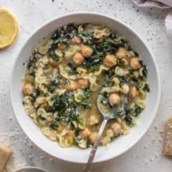 - Once the pasta is cooked, stir in the spinach. Taste and season with extra salt and pepper. Top with lots of parmesan cheese. Ladle into bowls and serve with a lemon wedge for spritzing.