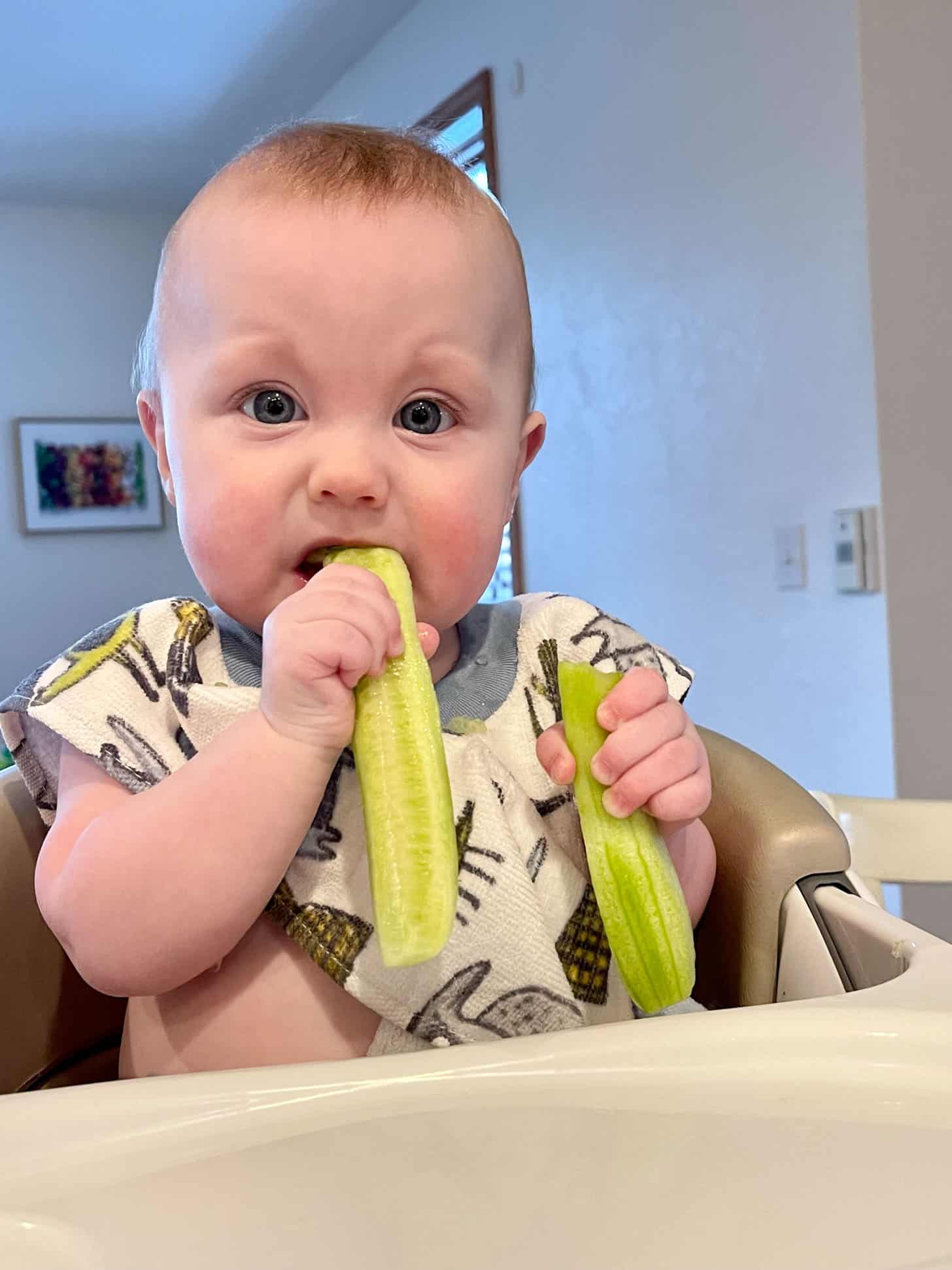 Cold cucumber teethers before dinner are his favorite. He has like seven teeth coming in at once!