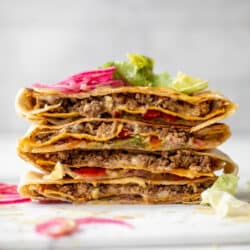 These cheeseburger crunchwraps are unreal. Cheesy beef, house sauce, crispy tostada shell with cheddar, tomatoes, lettuce and pickled onions. So crispy and incredible!