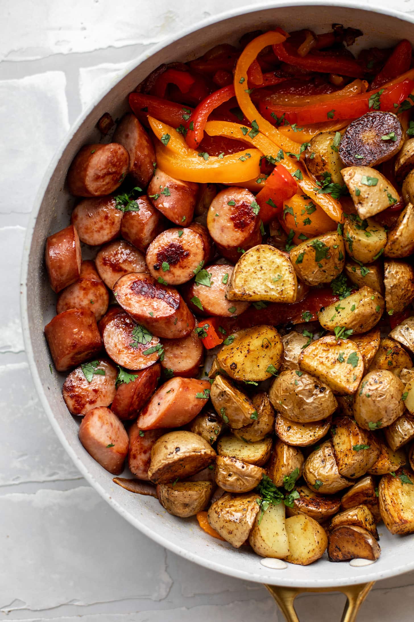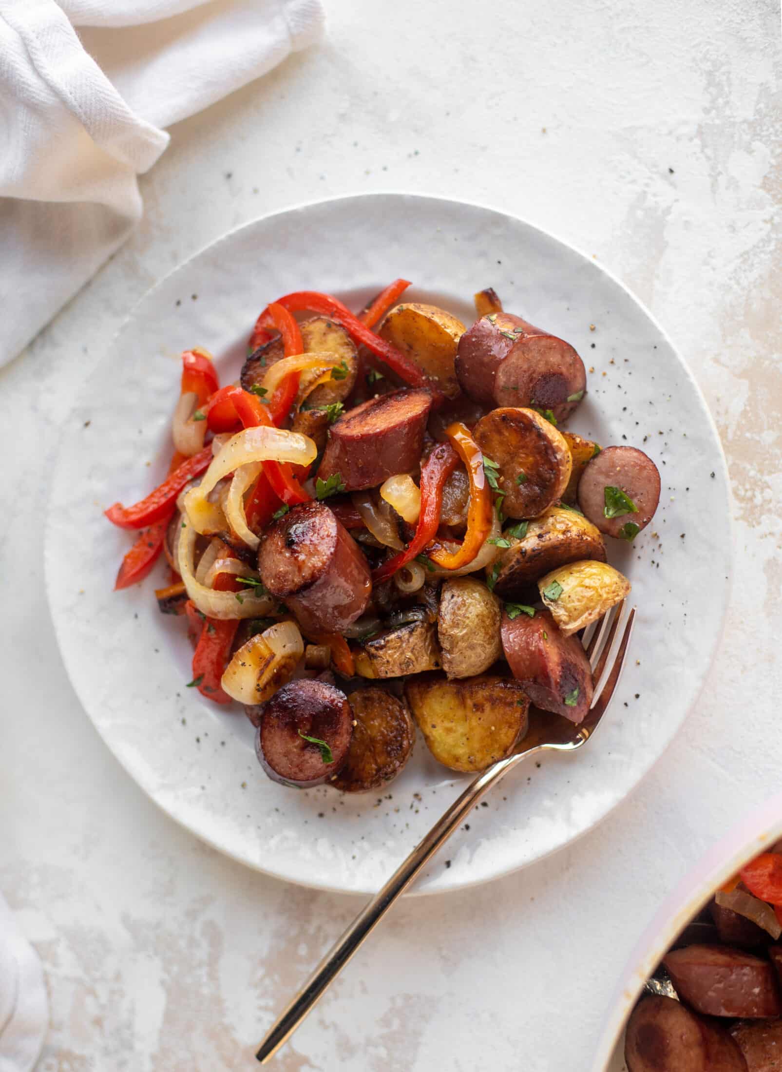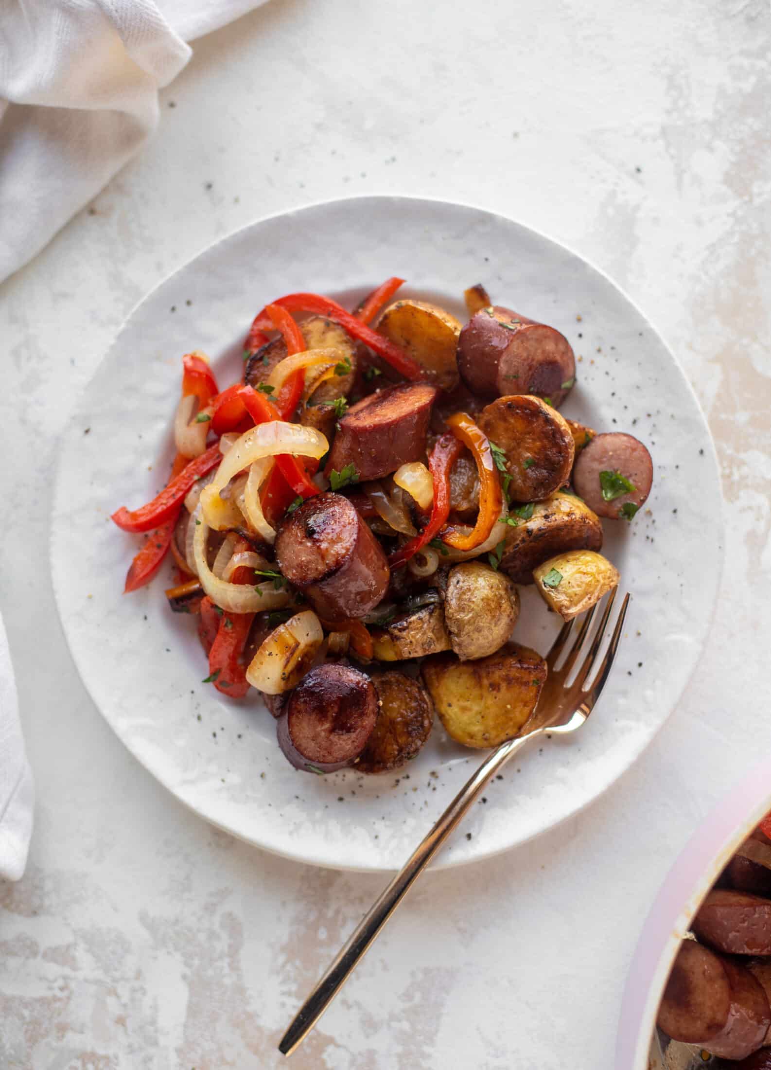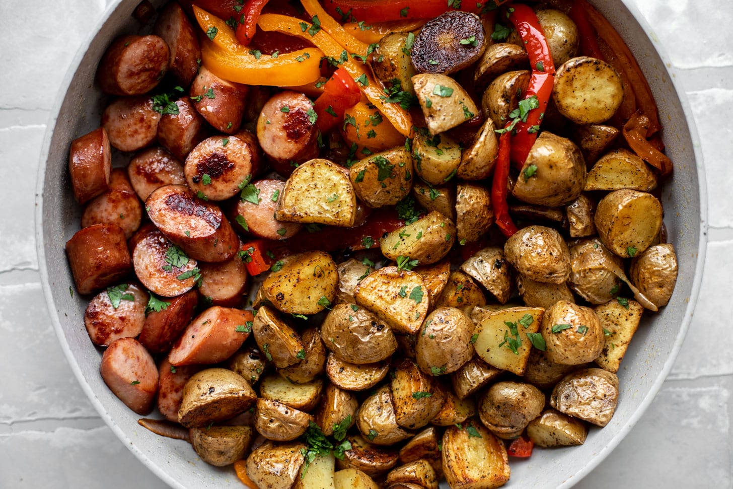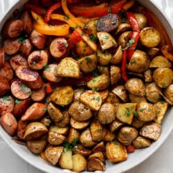 My sheet pan smoked sausage and peppers recipe is so popular here on the blog – you guys love it. It’s an even easier version of this meal, minus the potatoes. For this recipe, we’re adding crispy yukon gold potatoes that are buttery on the inside.