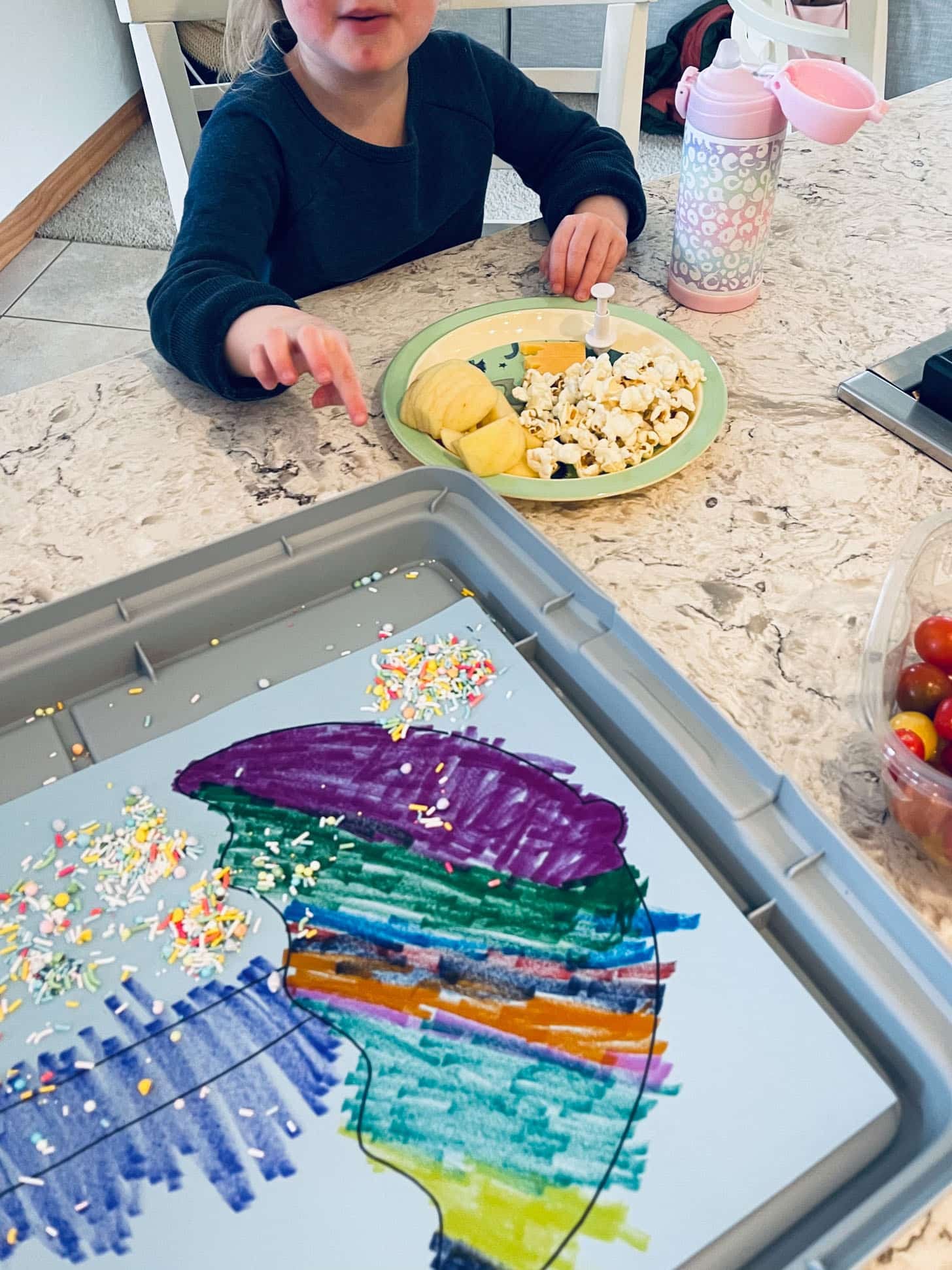 School crafts and snack plates. She had to make the umbrella rain something. She chose sprinkles!!