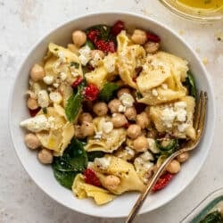 One of my favorite lunches is this chickpea tortellini salad. Packed with red peppers, artichokes and spinach, it’s drizzled in a lemon feta dressing and perfect to make ahead for a great lunch or side dish!