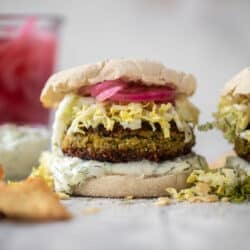 We love these falafel burgers! Crispy, chewy falafel burgers on a toasted english muffin bun with a tzatziki slaw and pickled onions. This meal is absolute perfection!