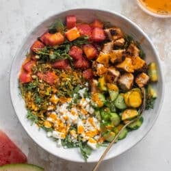 I photographed that recipe in 2019 and tested it in 2018… meaning I have lots of chicken and watermelon salads under my belt. The combination is so fabulous. It’s the best summer salad because of the smoky, charred chicken paired with the juicy, refreshing watermelon. There are so many things about it that I love.