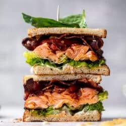 I know that a club sandwich technically has layered bread, but since the salmon is thicker, I find that no extra bread is needed. I stick with the classics of tomato, lettuce and bacon – along with a fancy mayo to keep things exciting.