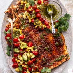This summer salmon recipe is my favorite! Grilled blackened salmon served with herby chimichurri and a tomato corn salad. It’s delicious and satisfying!