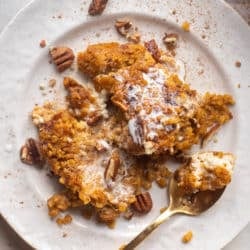 This pumpkin cheesecake baked oatmeal is an autumn dream! It’s chewy and textured, stuffed with maple mascarpone cheese and topped with toasted pecans. Tastes like absolute heaven!