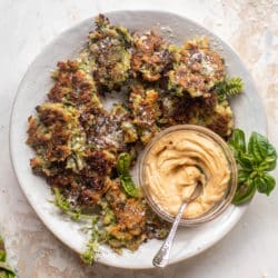 We love these brussels sprouts fritters! They are golden, crunchy, crisp and flavorful, topped with parmesan and served with a sun dried tomato basil dipping sauce. Absolutely delicious and perfect as an appetizer or side dish!
