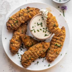 These chicken fingers are coated in crunchy breadcrumbs with lots of homemade ranch seasoning and crispy crushed cheddar crackers. Then, they’re baked until the inside is tender and the outside is crunchy and the flavor explodes.