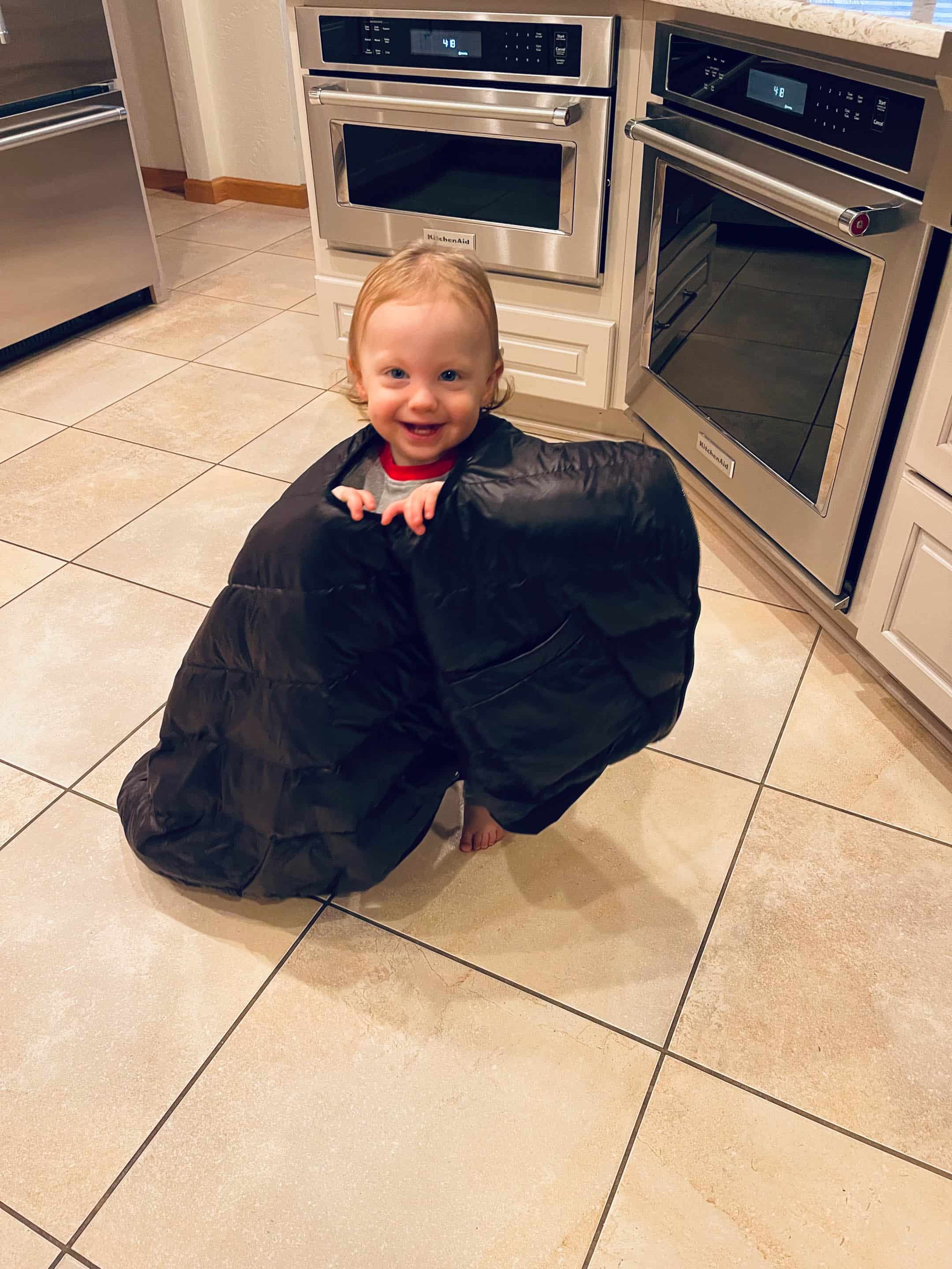 Jordan is obsessed with putting my vest on his head through an armhole. He loves walking around like this.