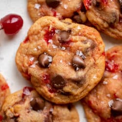 Maraschino cherry chocolate chip cookies are perfect! Chewy and chocolaty with bites of sweet cherry inside. Festive and delicious and a unique spin on the classic!