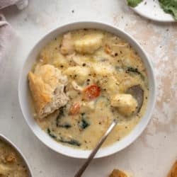 You know I always call these a “hug in a bowl” and that could not be more true for this recipe. A super cozy bowl of creamy chicken and vegetable soup, studded with ricotta dumplings.