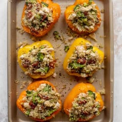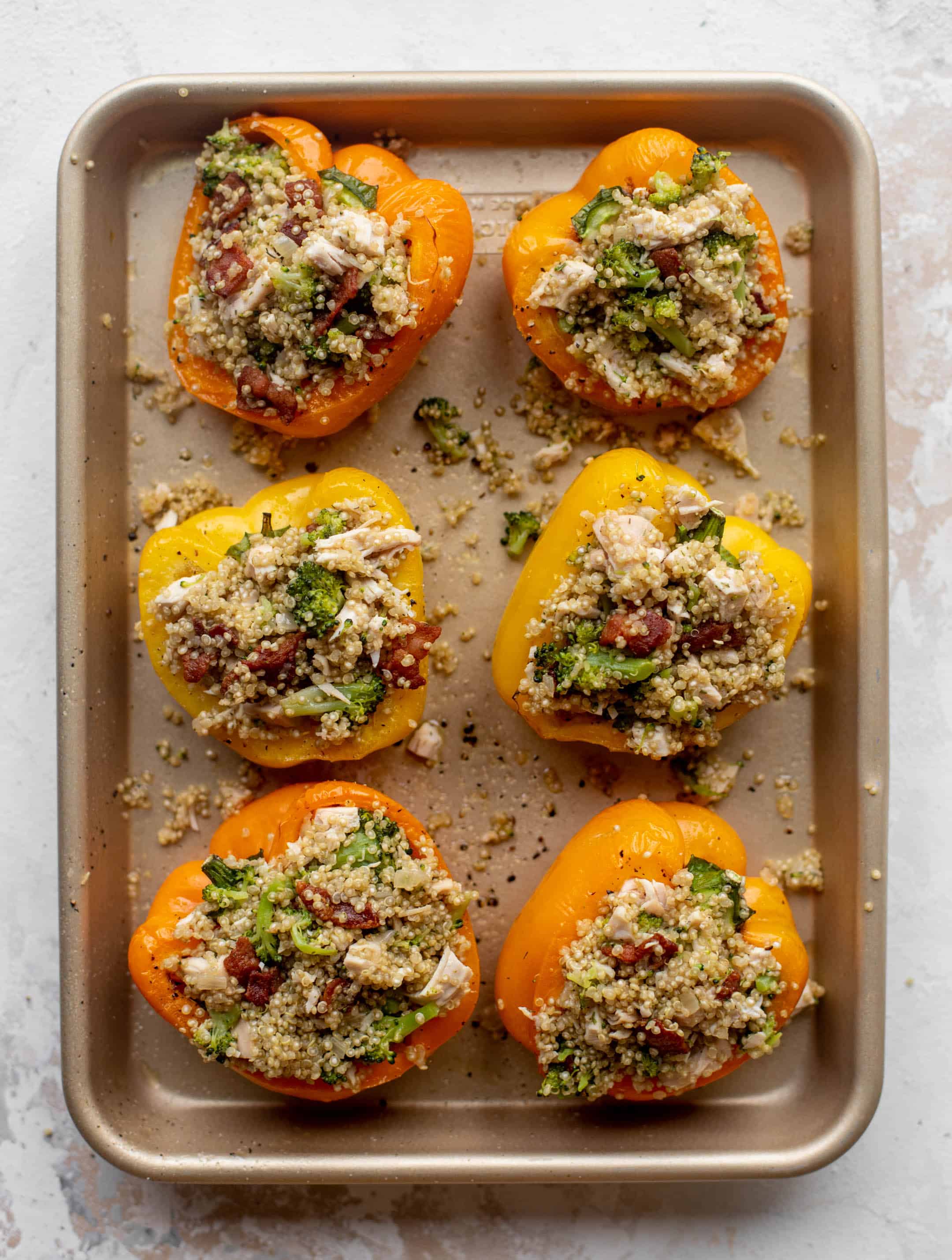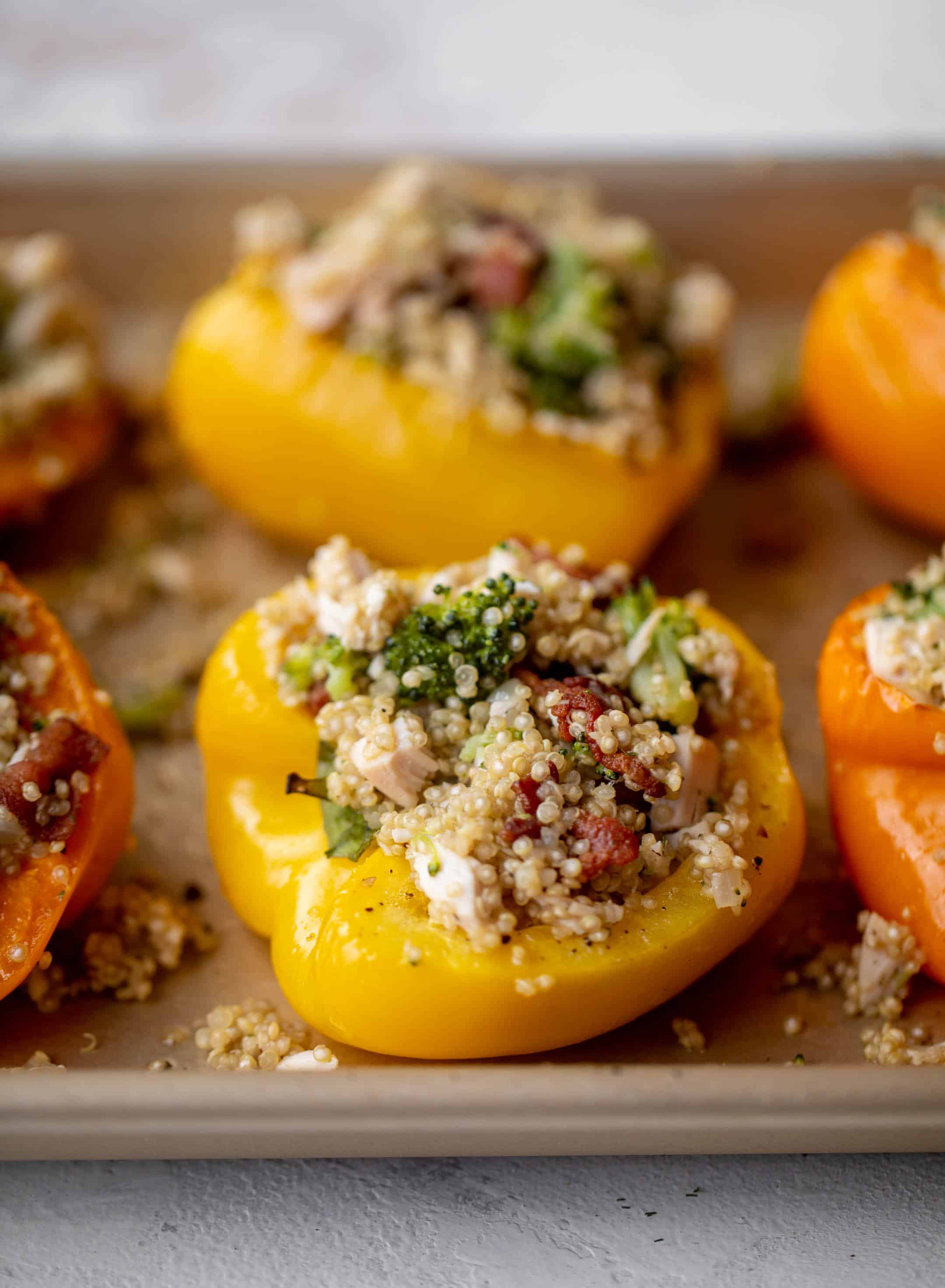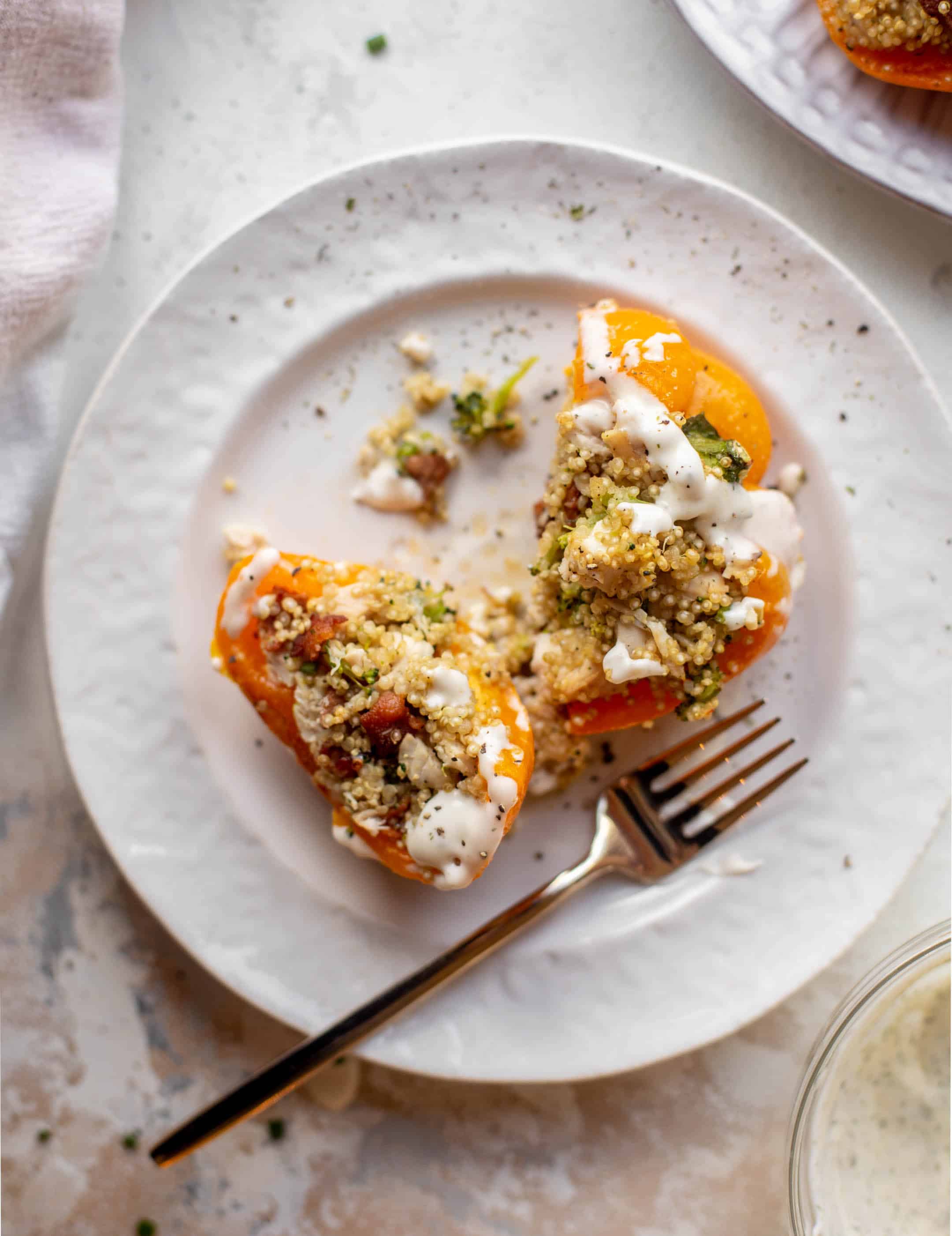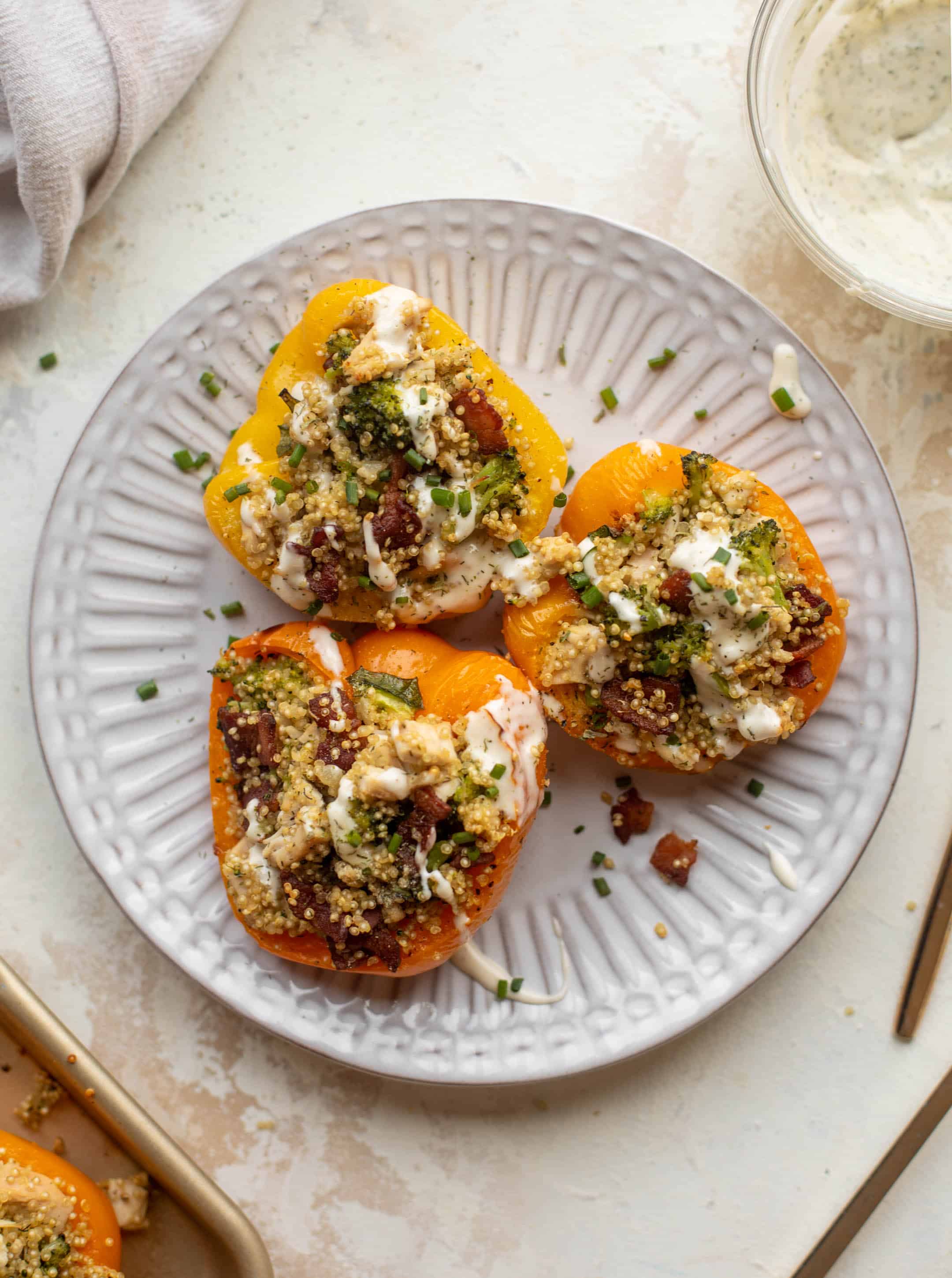 We love these chicken bacon ranch stuffed peppers! Caramelized peppers stuffed with a quinoa filling, loaded with chicken, broccoli, bacon, ranch seasoning and more. So satisfying and delicious!