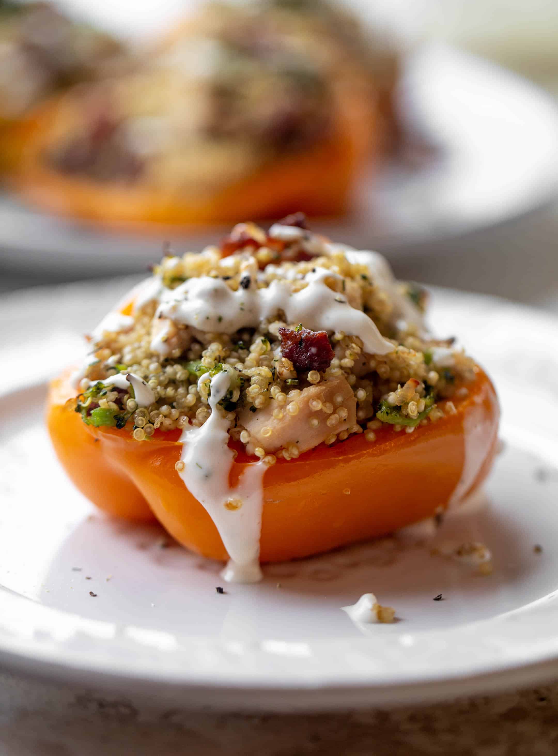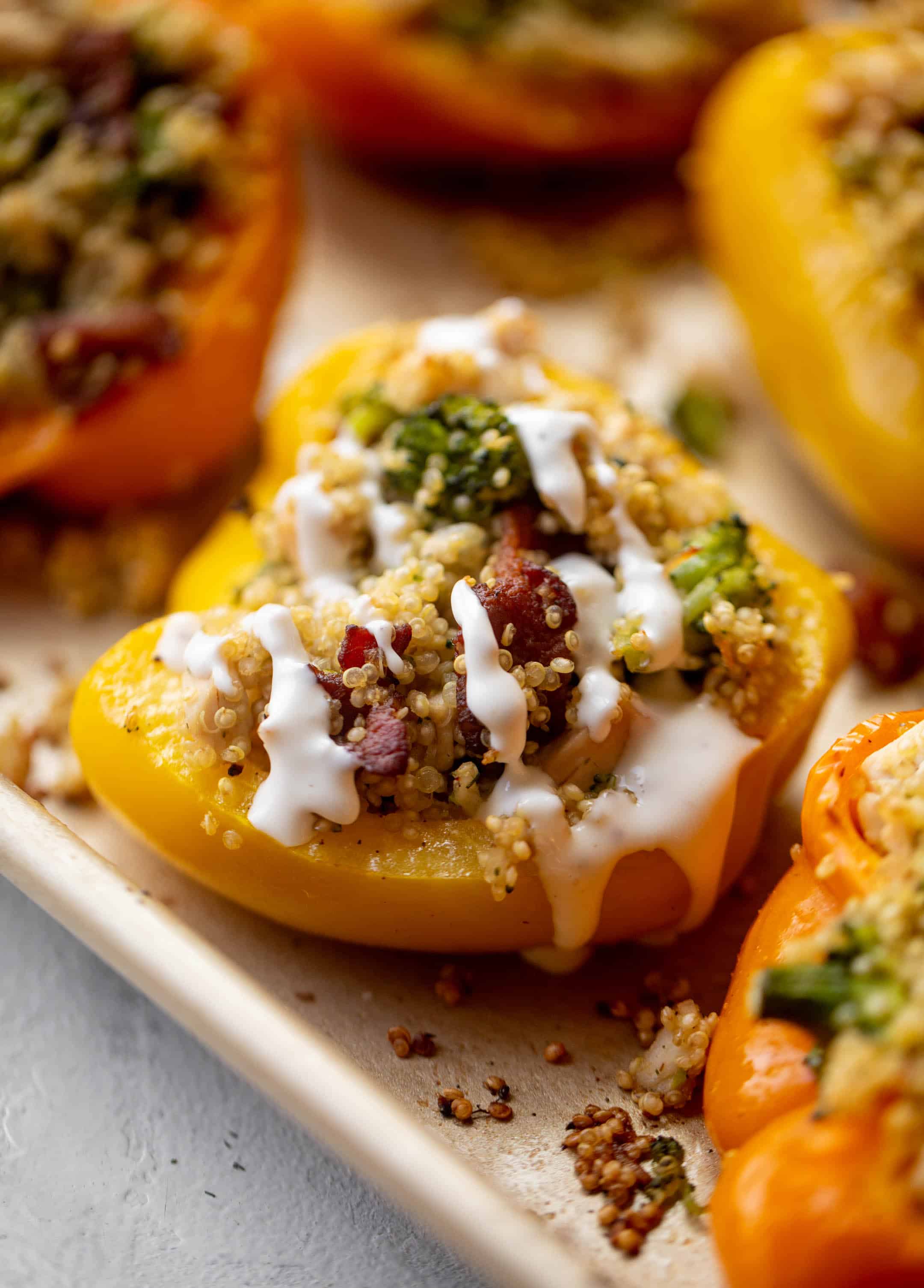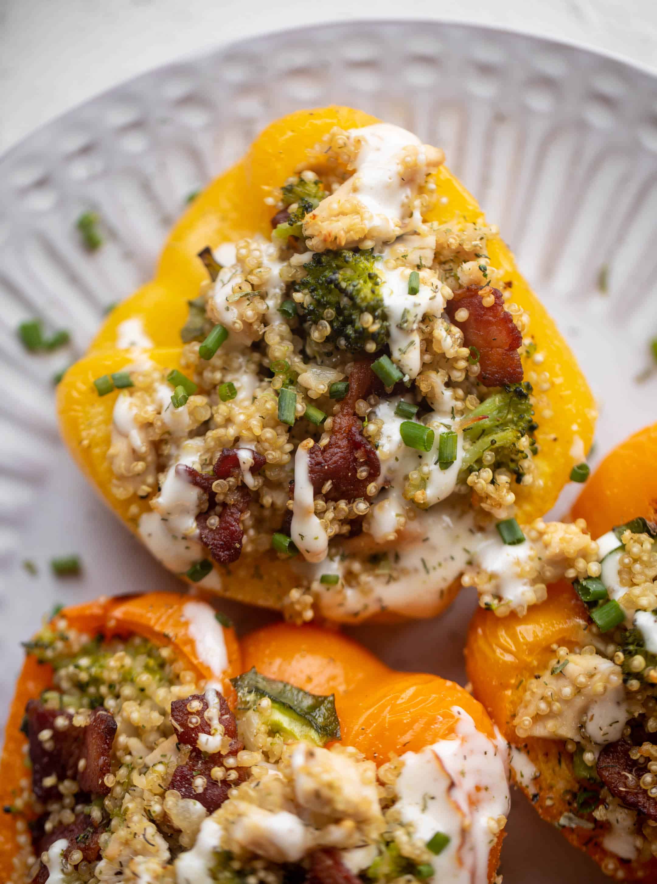 These peppers are stuffed with a broccoli chicken quinoa filling, made with crispy bacon and drizzled with ranch dressing. They are warm, cozy, incredibly satisfying and taste absolutely wonderful. You don’t want to pass these up!
