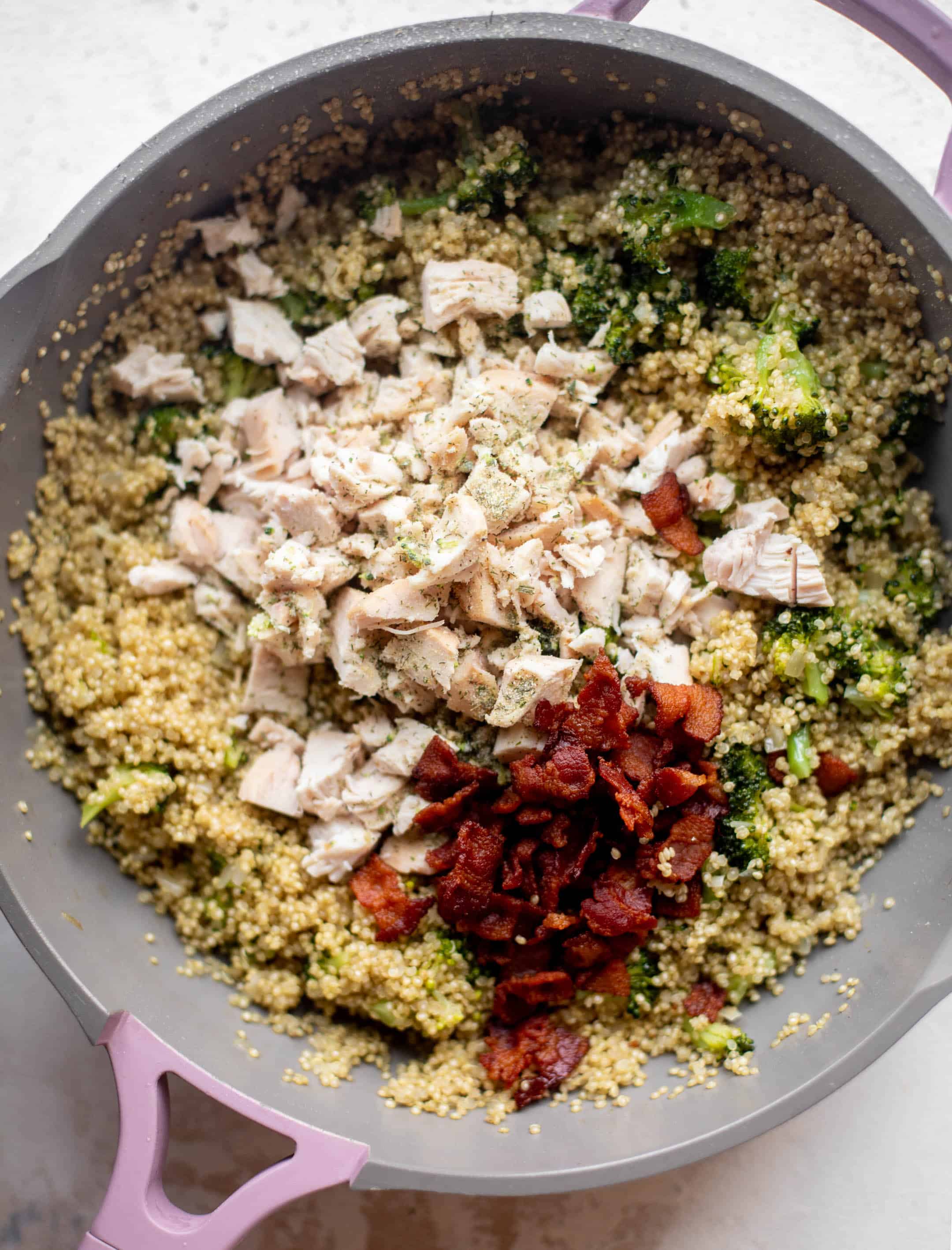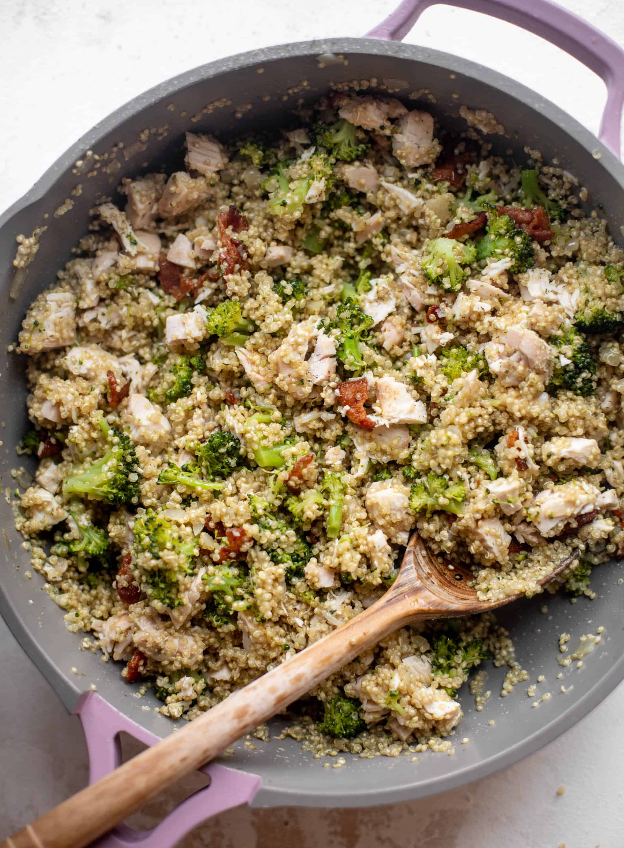 - Add the onion and garlic to the bacon grease over medium-low heat. Cook until sosftened, about 3 minutes. Stir in the broccoli, cooking for another few minutes. Add the quinoa and chicken stock. Bring the mixture to a boil, then reduce it to a simmer. Cover and cook for 15 minutes, or until the quinoa fluffs easily with a fork.