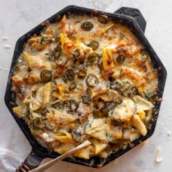 This one deserves all the exclamation points. We have a cheesy, melty pasta bake made with smoky butternut squash, shredded chicken, lots of fresh spinach and ton of pickled jalapeños! This skillet is dreamy.