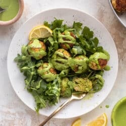We love green goddess meatballs! These chicken meatballs are made with all the components of green goddess dressing: herbs, lemon, garlic – and also drizzled in a green goddess sauce. They are super tender and juicy and delicious!