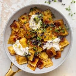 The easiest toasted skillet ravioli is one of the best weeknight dinners you can make! Ravioli is toasted in brown butter then tossed with fresh lemon zest, ricotta and herbs. It’s super simple and delicious!
