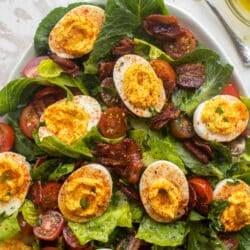This deviled egg salad is a fun way to serve deviled eggs! Crisp romaine, fresh tomatoes and crunchy bacon come together with an herby vinaigrette to make the best base for the deviled eggs. Ideal for brunch or lunch!