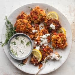 Salmon fritters are crispy on the outside and buttery and flaky on the inside, made with roasted red peppers and lemon and garlic. Cook until golden and crunchy and then dip in the most delicious creamy dill sauce. Delish!