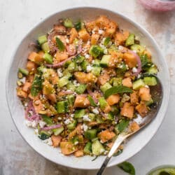 Chopped cantaloupe and cucumber come together in this super refreshing, cooling bowl of goodness. Mixed with fresh herbs, creamy feta cheese, some roasted pistachios and tangy pickled onions, this is ridiculously delish. Oh and the vinaigrette – pure heaven!